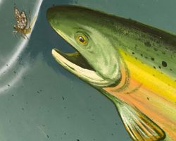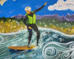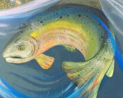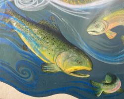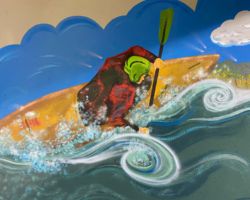 Go with the Flow is inspired by the Uncompahgre River and commissioned by the City of Montrose for the 700 square foot West Main Street underpass along the Connect Trail. This mural presents a cross-section of the river environment, stressing stewardship and harmony between the natural and recreational uses. The state fish, a greenback cutthroat trout, swims in the currents below as local boaters surf the rapids above. Native flora thrive along the river’s banks and the distant mountain ranges are visible on the southwest horizon.